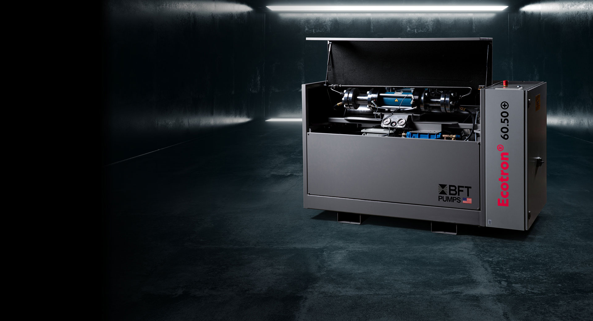 The ECOTRON® high-pressure pump is available in the power classes 15 HP to 60 HP. Its numerous increments allow individual adaptation to every requirement. ECOTRON® is our basic model with flow rates between 0.9 l and 2.5 l per minute and an operating pressure of 50.000 to 60.000 psi. It thus strikes the perfect balance between long maintenance intervals and high cutting speed.