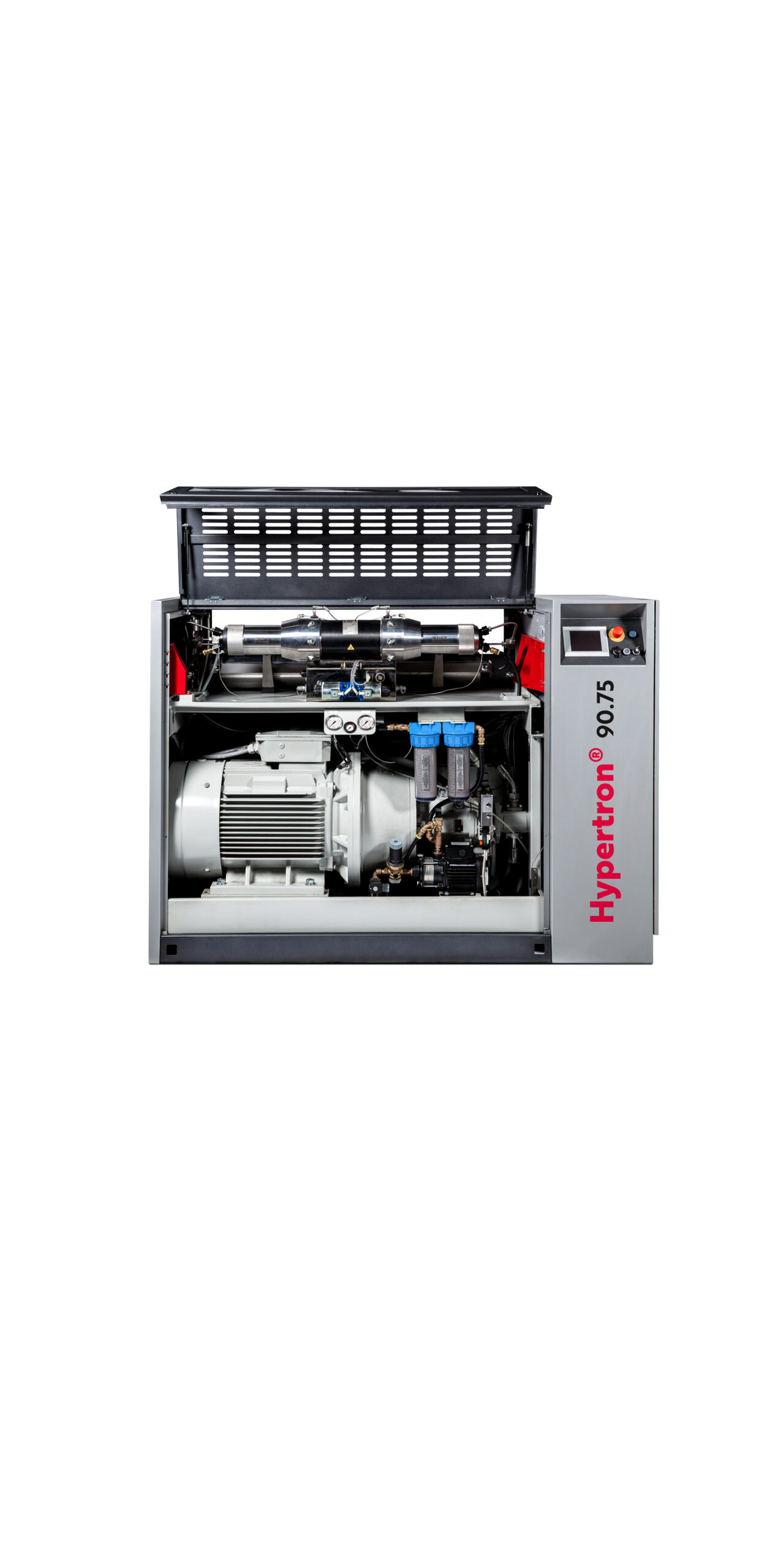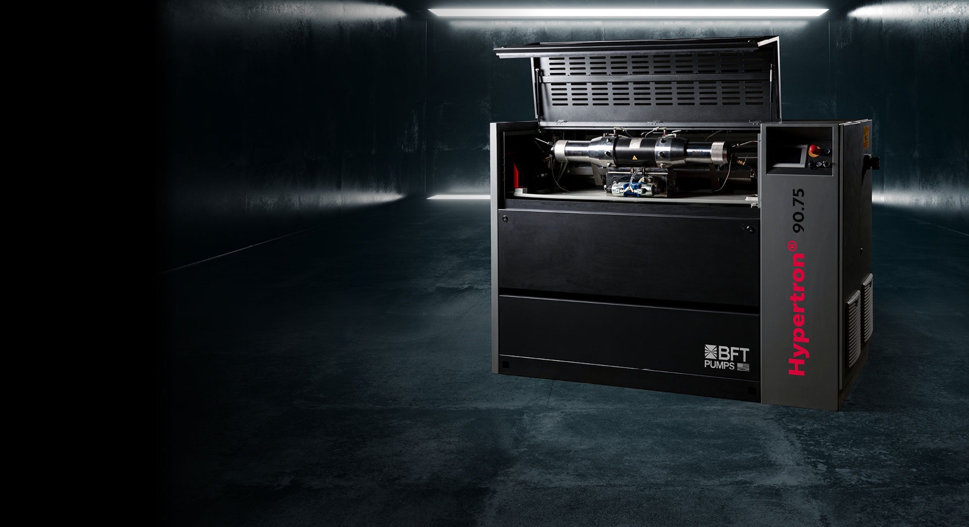 In the HYPERTRON® high-pressure pumps, an axial piston pump with electronic pressure/flow controller is driven by an asynchronous motor with frequency inverter. The hydraulic units have high control dynamics. The use of two soft-switching hydraulic valves with specially matched control geometry ensures extremely short switching times.